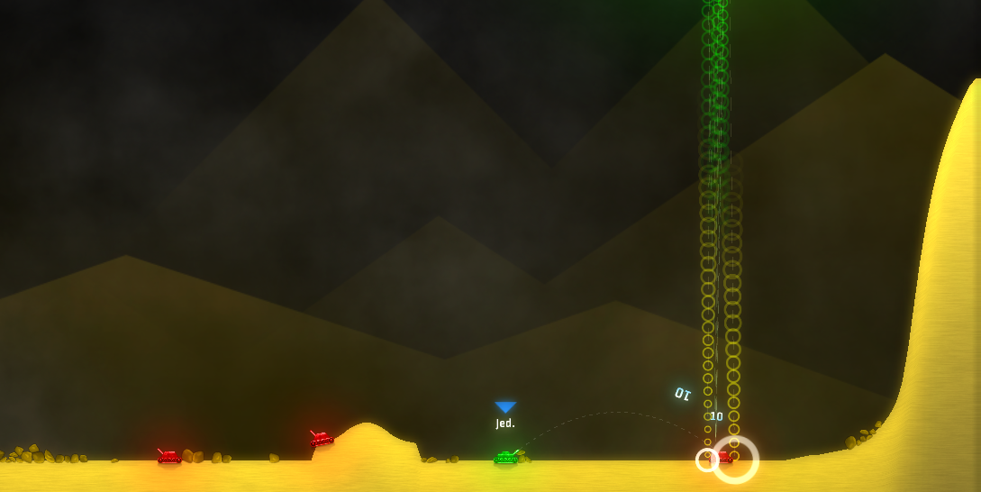 Upon hitting the ground, Mini-Pinger will send 3 yellow projectiles straight up into the air with a random angle. They will travel beyond the top of the map, before returning down to the ground. The projectiles are affected by wind. Because they travel a long distance even small winds may influence them. One thing to note is that if the projectiles are unable to make it past the top of the screen before hitting the ground, they will do nothing upon impact. This will happen if the initial shot lands underneath a bumper.